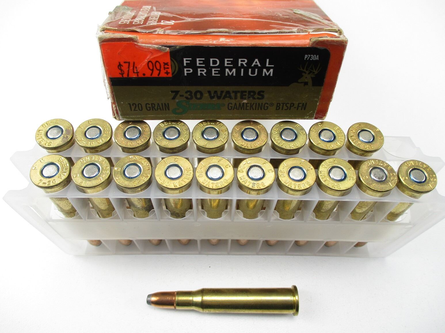 Federal Cartridge offers manufactured 7-30 Waters cartridges—the Federal Premium Vital-Shok firing a 120-grain (7.78 g) Sierra GameKing boat-tail soft-point flat-nose bullet at 2700 ft/s with 1940 ft-lbs of energy. It has a sectional density of 0.213
